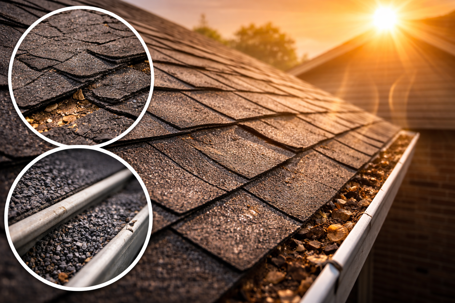 Texas summers can drive roof temperatures up to 160°F or more, and prolonged exposure to UV rays slowly dries out roofing asphalt. With three-tab shingles, this often leads to warping and curling, especially on older roofs or roofs without proper ventilation. Over time, UV exposure weakens the asphalt coating, causing faster granule loss and reducing the shingle’s protective layer.